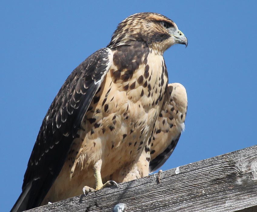 Swainson's hawk lives on open plains, prairies, agricultural areas, and other grasslands. It is often seen perched on poles and fence posts looking for prey.