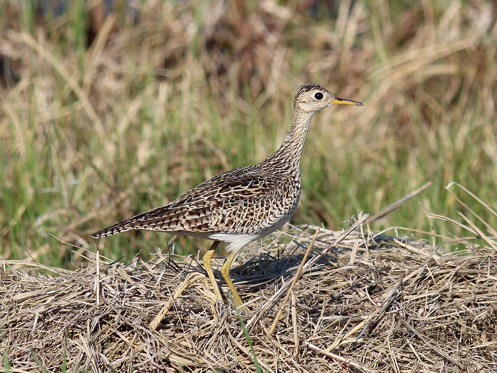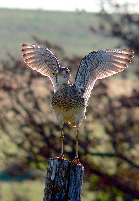 Upland SandpiperThe upland sandpiper often perches on fence posts, stumps or telephone poles. When frightened, it runs a short distance and then freezes in an attempt to blend into its background.