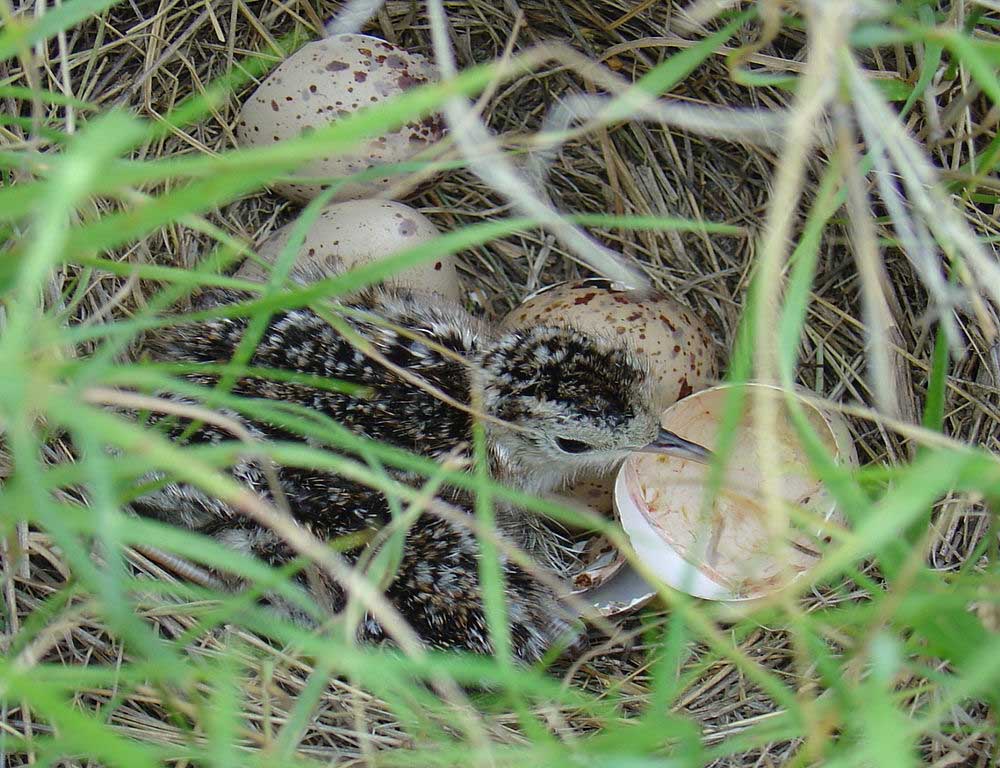 Upland SandpiperBoth the male and female create a nesting spot by scraping out a depression in the ground. The nest is made under a bush or in a clump of grass. Sometimes grass is pulled down over the nest to help hide it. The female lays 4 eggs, and both the male and the female incubate the eggs. The chicks hatch in 21-27 days and  fledge in about a month. The chicks are precocial and start hunting insects shortly after birth.
