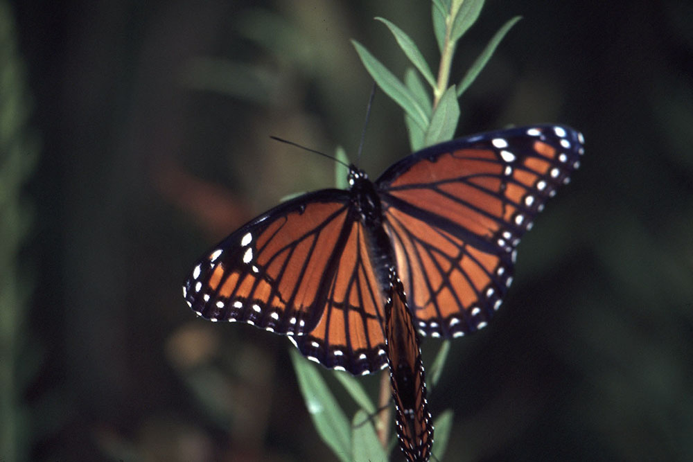Viceroy ButterflyThe viceroy and monarch were once thought to exhibit Batesian mimicry where a harmless species mimics a toxic species. Studies conducted in the early 1990's suggest that the viceroy and the monarch are actually examples of Mullerian mimicry where two equally toxic species mimic each other to the benefit of each. Just goes to show you there's always something new to discover in the natural world!