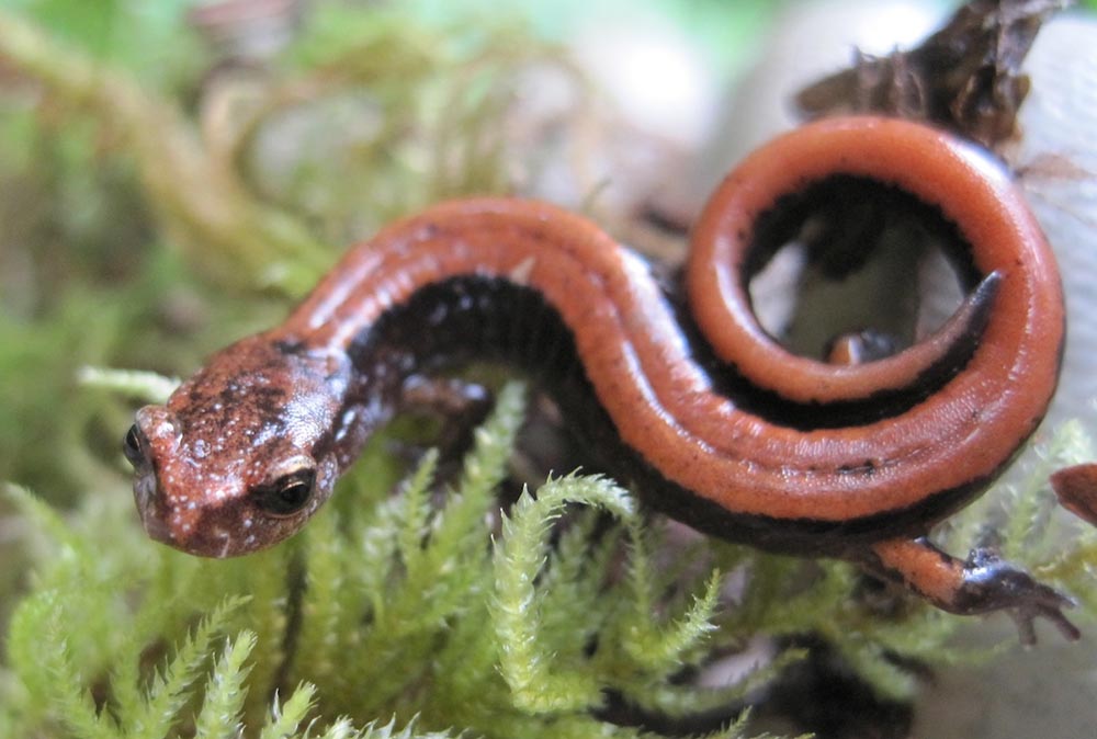 The western red-backed salamander lives and breeds entirely on land. It is nocturnal.