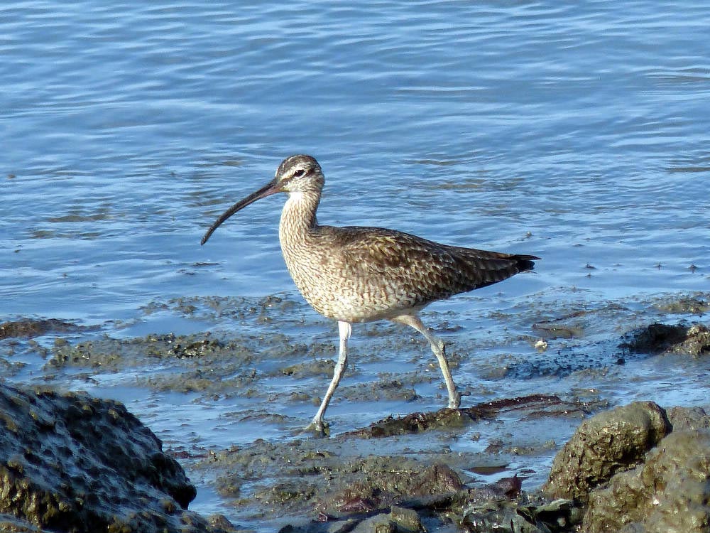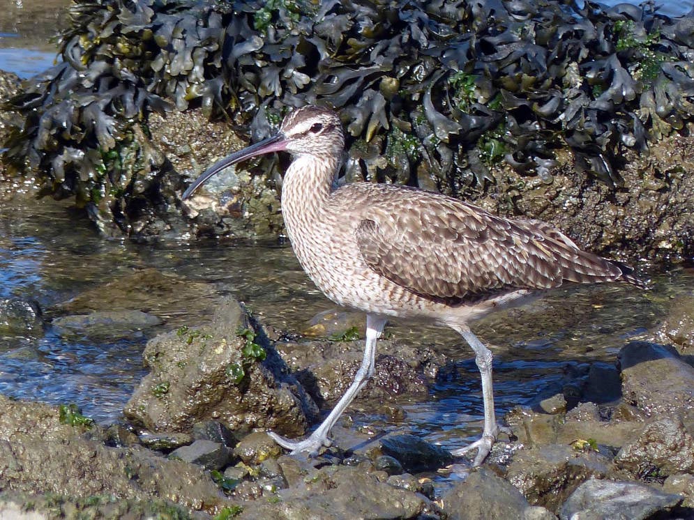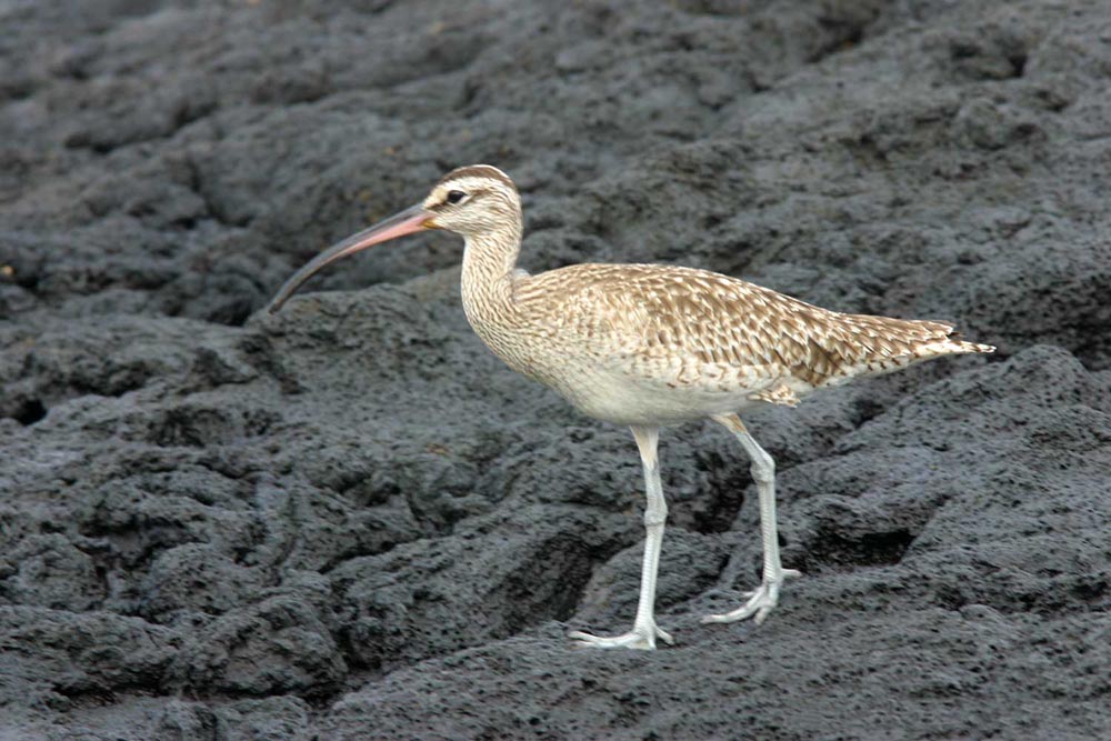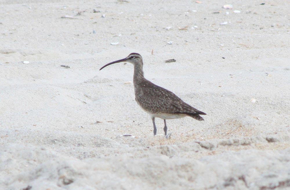 WhimbrelThe whimbrel is a large shorebird that is about 14 inches in length. It has a long, down-curved dark brown bill and long gray legs. It is a streaked brown on its uppersides, neck, and breast and white on its belly and rump. It has a dark brown crown, a grayish line above its eye, and a dark brown line that runs over its eyes like a mask.