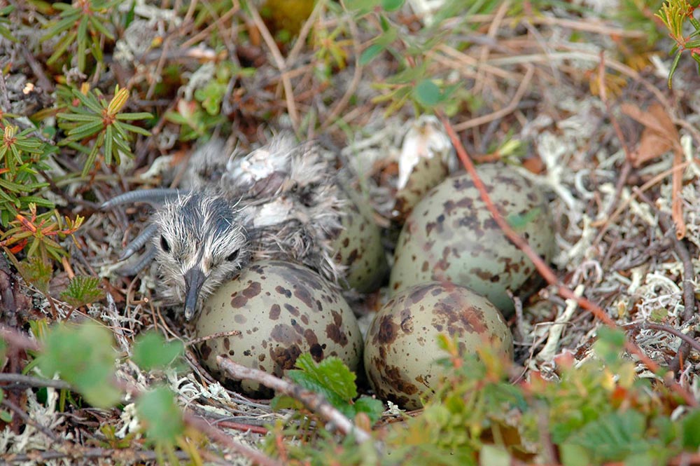 WhimbrelThe male whimbrel flies in circles over the breeding territory and sings as he tries to attract a mate. The female lays 3-5 eggs in a depression on the ground that is lined with moss, grass and lichen. Both parents incubate the eggs. Incubation takes 27-28 days. The chicks leave the nest and feed themselves shortly after they are born. Both parents care for the chicks until they fledge 34-42 days after hatching.