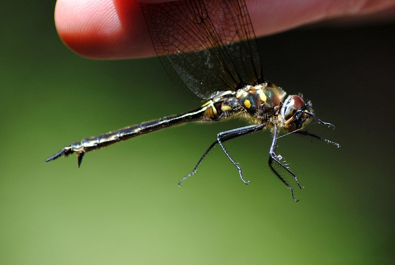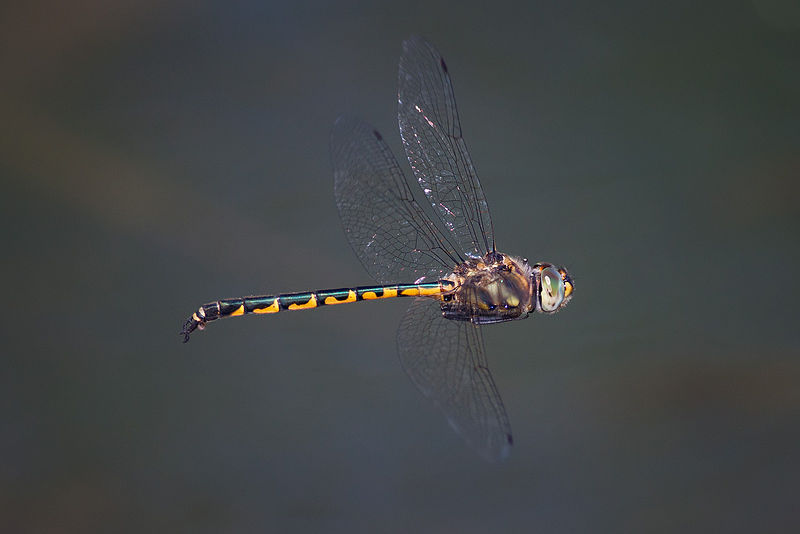 The dragonflies in this family are large, usually between 1.5 and 3 inches in length. They have bright green eyes, and many species are black with metallic green or yellow markings.