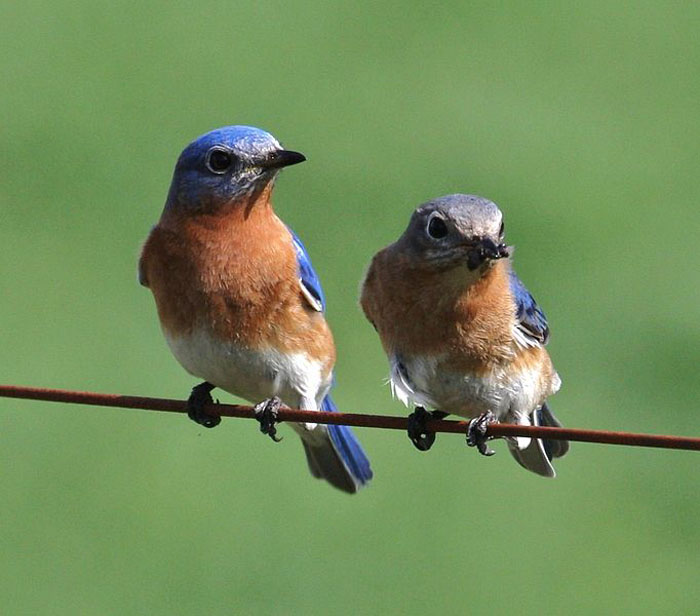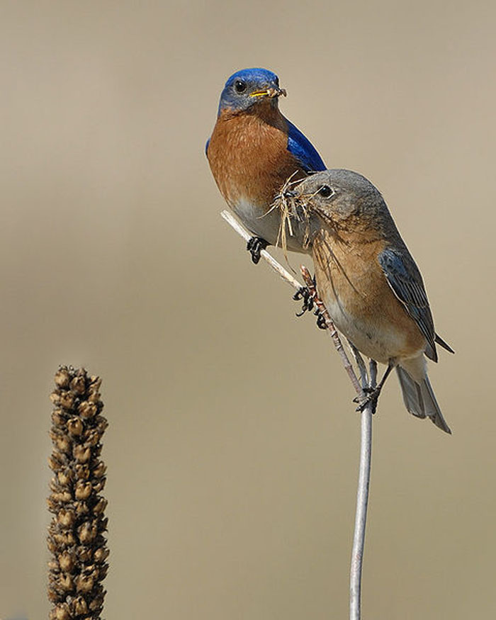 Eastern BluebirdBreeding occurs in the spring and summer. The Eastern Bluebird builds its nest in a tree cavity or a man-made nest box. The female builds the nest by weaving together grasses and pine needles and lines the nest with fine grasses and soft, downy material. She may use this nest several times. The female lays 3-7 light blue eggs, which she incubates for 13-17 days. Young chicks leave the nest 15-20 days after hatching. Both the male and female feed the young insects. The Eastern Bluebird can live for 6-10 years.