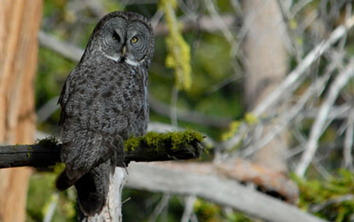 Most of the Great Gray Owl's diet is made up of small rodents like voles and pocket gophers. Occasionally, it will also eat small mammals, such as shrews, and birds. To hunt, the Great Gray Owl perches on a tree overlooking an open area. Good hearing allows the owl to accurately locate prey below several feet of snow. From its perch, the Great Gray Owl plunges through the snow to capture its prey.