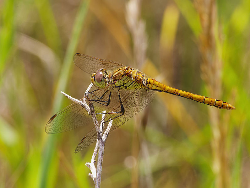 The saffron-winged meadowhawk is found near ponds and lakes and sometimes bogs.