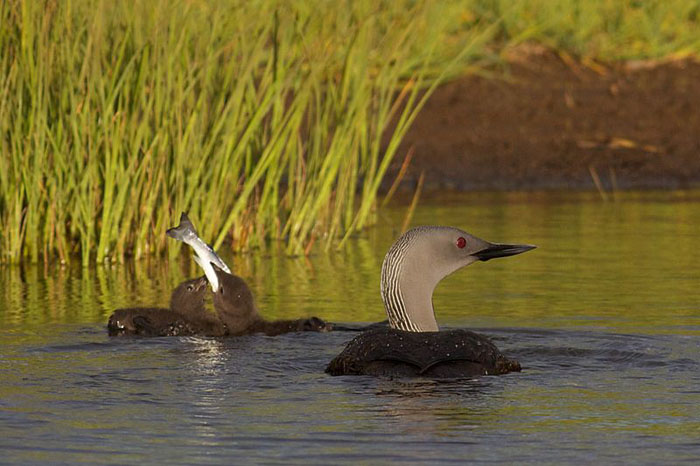 Breeding begins when the spring thaw occurs, usually in May. The male selects a nesting site close to deep water. The male and female build the nest from a heap of plant material. The female lays two eggs, which are incubated for three weeks by the male and female. After 2 or 3 weeks, the chicks begin swimming and spend most of their time in the water. At this point, they still rely on their parents for food. After 7 weeks, the chicks can fly on their own and are independent from their parents.