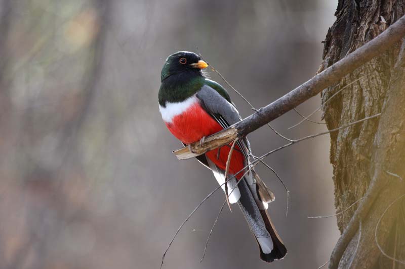The elegant trogon is found in southern Arizona and Mexico as well as in Costa Rica, El Salvador, Guatemala, Honduras, and Nicaragua.