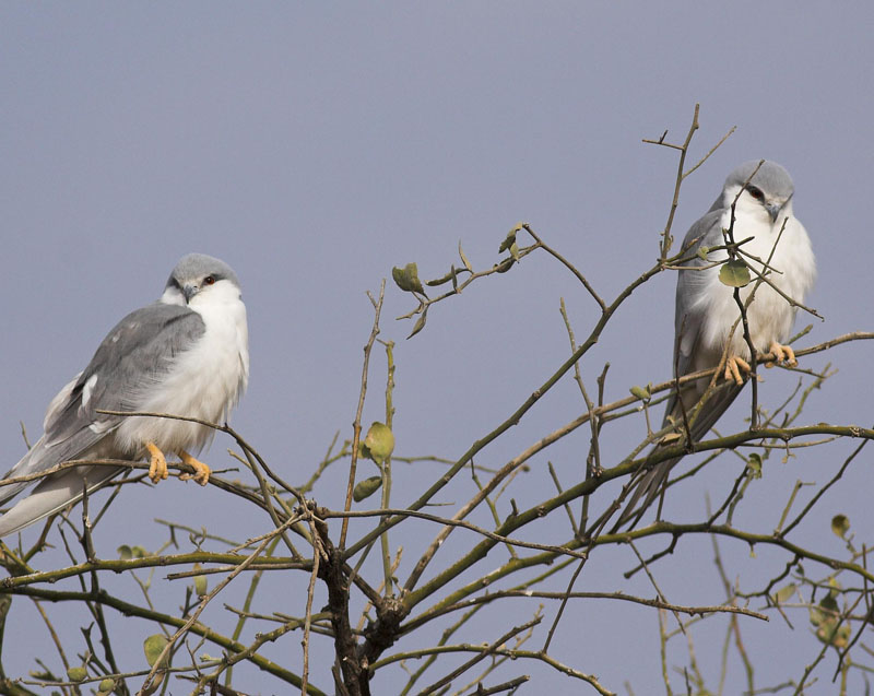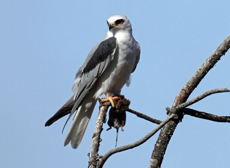 The white-tailed kite hovers over open areas in search of mice, snakes, and other prey.