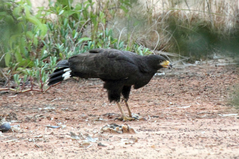 The zone-tailed hawk is mostly black. It has a white band on its tail.