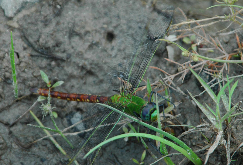 Darner naiads (immature dragonflies) are long and slender. They move through the water by squirting water out of their abdomens. They climb over submerged vegetation hunting for food. They eat mosquito larvae, damselfly and dragonfly nymphs, tadpoles, and small fish. When a naiad is the right size, it crawls up on a plant stem, its skin splits, and a dragonfly emerges. To avoid predators, naiads usually do this at night.
