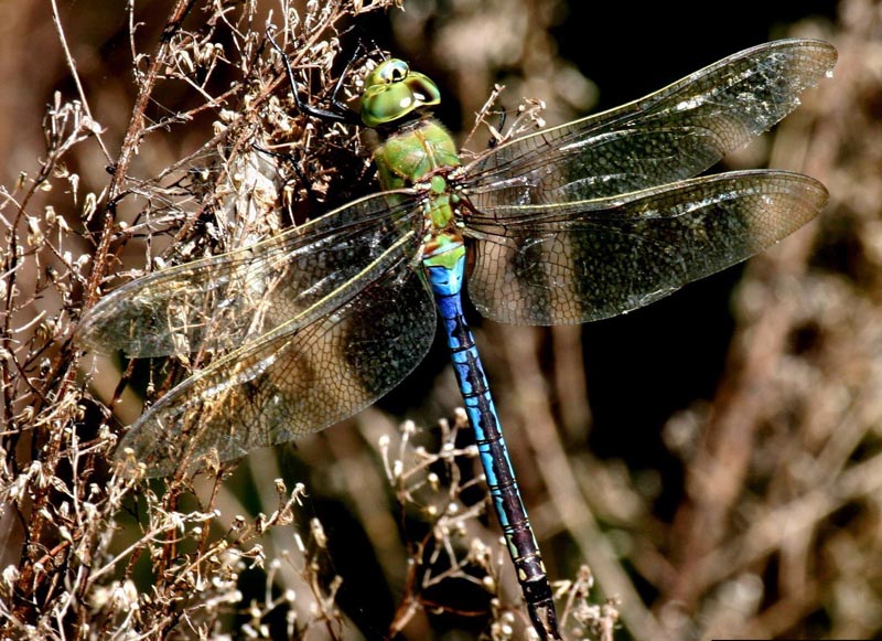 Darners have long, thin abdomens; four transparent wings; and large, round, compound eyes that meet at the top of their head. Most species are blue or green or a combination of blue and green.