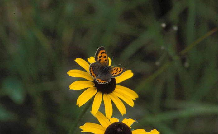 The male American copper perches in grassy areas and waits for a female. The female lays one egg at a time on the leaves of a host plant.