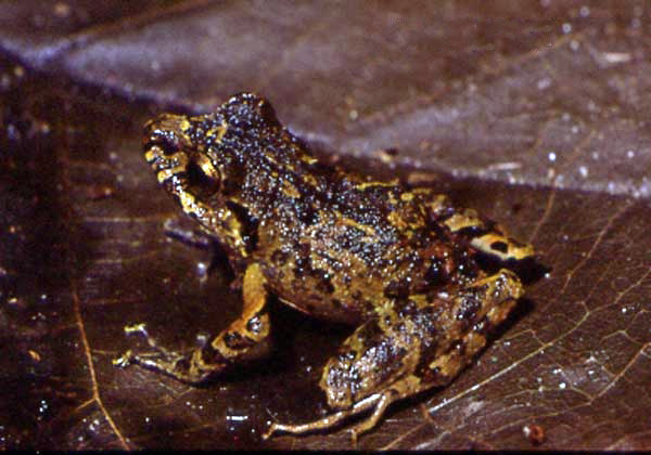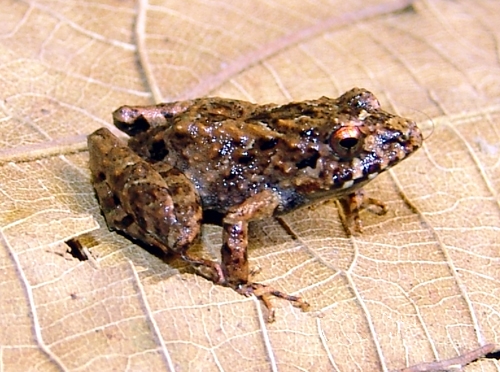 This frog is found in thick leaf-litter. It is found in Brazil.