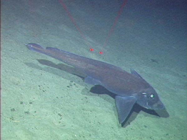 They have one pair of grinding tooth plates in their lower jaw and two pairs of grinding tooth plates in their upper jaw that stick out of their mouth like a rabbit's teeth! They have thick bodies that taper to a long, thin rat-like tail. Males have three grasping organs. They have two graspers on their pelvis that they use when they are mating. They have one grasper with a hook on it on their heads that they use to catch a female. Female chimaeras have a dent in their heads that the hook fits into! Chimaeras have two dorsal fins. The first dorsal fin has a