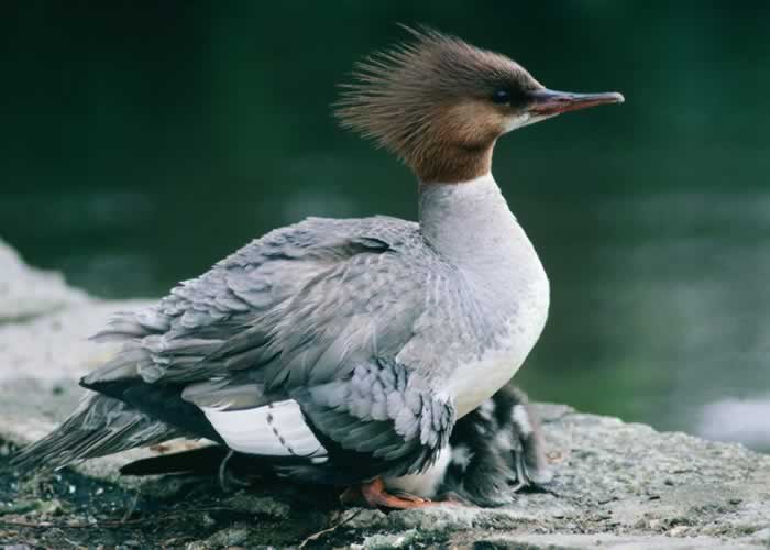 The common merganser is a diving duck that is 22-28 inches in length with a wingspan of 34 inches. It has a long, thin, serrated bill and brown eyes. The male's bill is reddish-orange and the female's bill is orange.