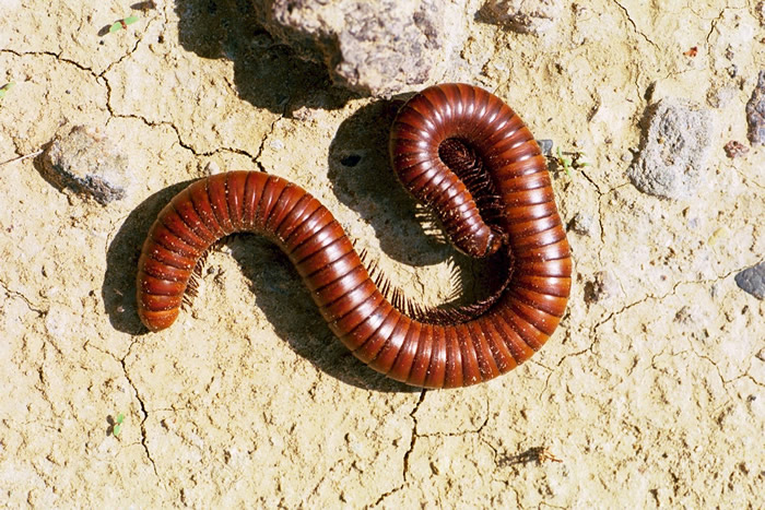 Millipedes don't have poison claws like centipedes. When they are threatened, they usually coil up in a ball. Some species emit a poisonous or smelly secretion. Most species of millipedes are scavengers or herbivores and eat decaying vegetation and leaf litter. |