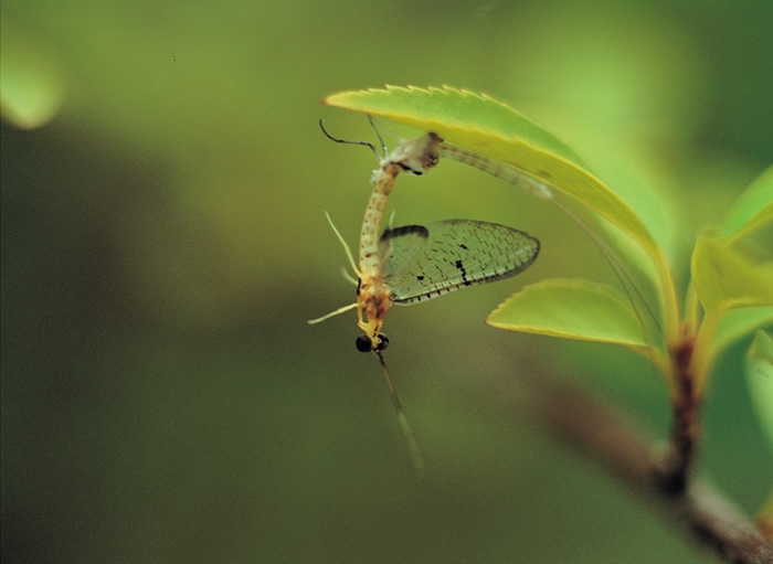 Adult mayflies don't eat. They quickly mate and die. The male dies right after mating, and the female dies after she has deposited her eggs.