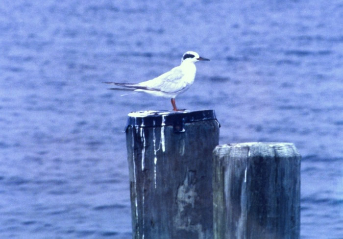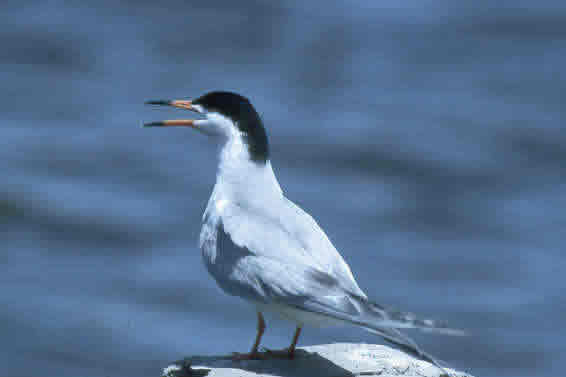 inches. It has white undersides and a white throat and breast, a light gray back, and white-tipped gray wings. It has a black cap on its head, a deeply forked gray tail, orange legs and feet, and a long orange bill with a black tip. In the winter, it loses the black cap on its head and its bill turns black. It also develops black patches on its eyes and on the side of its head. Males and females look alike.