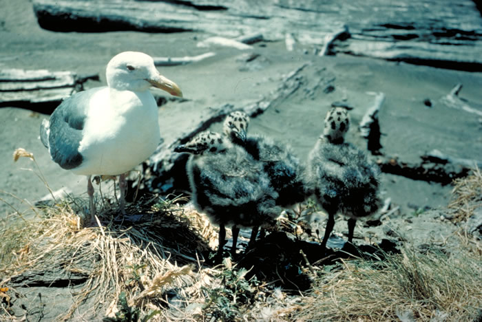 The glaucous gull nests in colonies on islands, at the edges of cliffs, on the tundra, at the edges of ponds and lakes, or on the beach. The male and the female build a nest of grass, twigs, moss, and sometimes feathers in a depression in the ground. The female lays 1-3 eggs. Both parents incubate the eggs for 28 days, and both parents care for and feed the chicks.