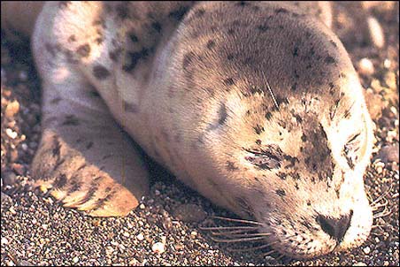 The harbor seal has a gland in its skin that secretes an oil that waterproofs its fur. It has a rounded head, a short snout, and a V-shaped nose that closes when it is under water. It has