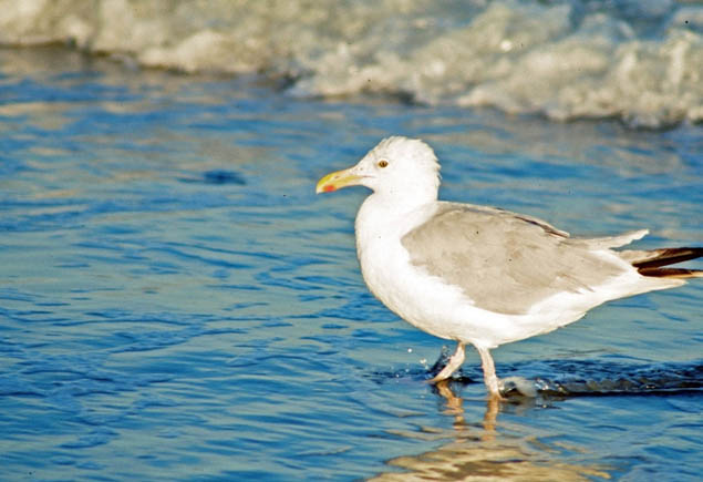 inches. It has a white head, throat, breast and belly. It has a gray back and gray wings with black tips. It has pale pink legs and feet, yellow eyes, and a slightly hooked yellow bill with a red spot on the end. Males and females look alike.