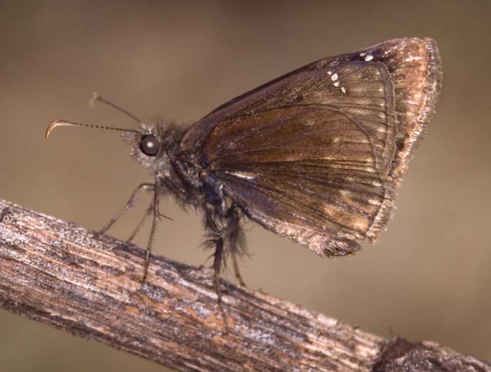 Horace's duskywing is found in sunny spots at the edges of woodlands, clearings, oak scrub, and roadsides.
