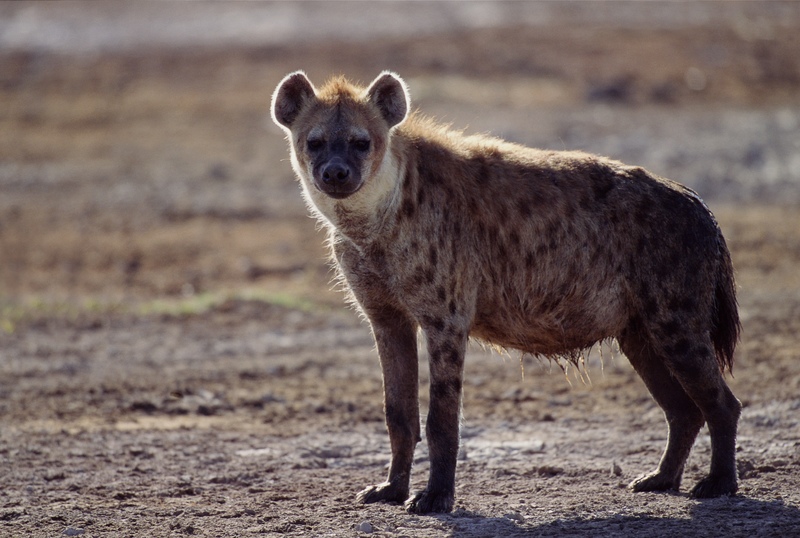 The spotted hyena has sloping shoulders, large ears, and spots!