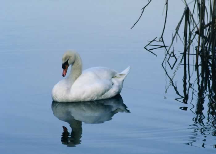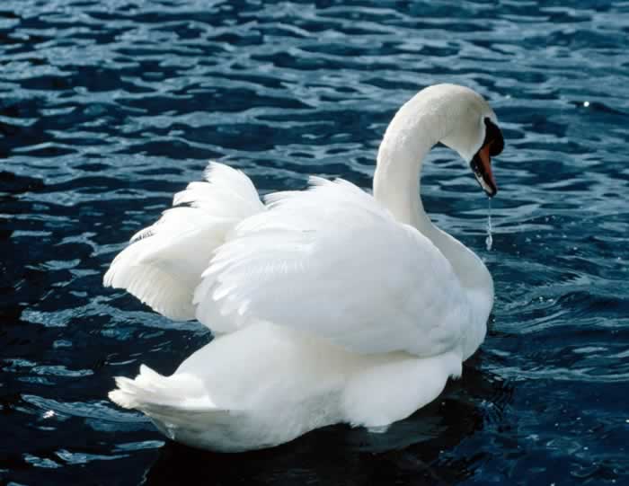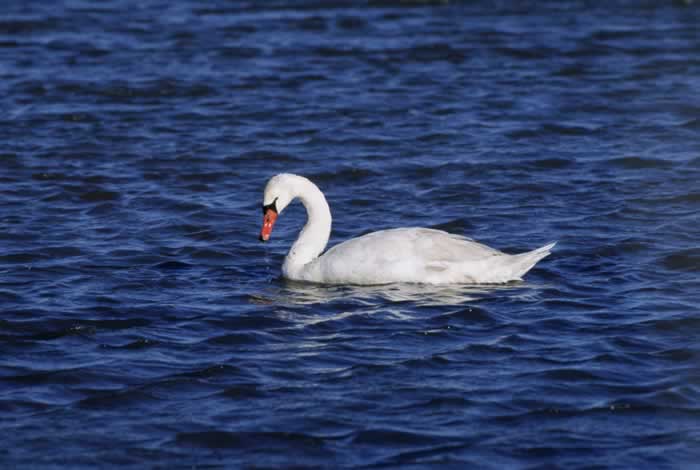The mute swan is 50-60 inches in length with a wingspan of about 82-94 inches. It is completely white and has a long, graceful neck; an orange bill with a