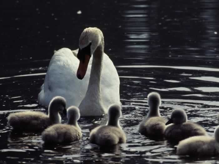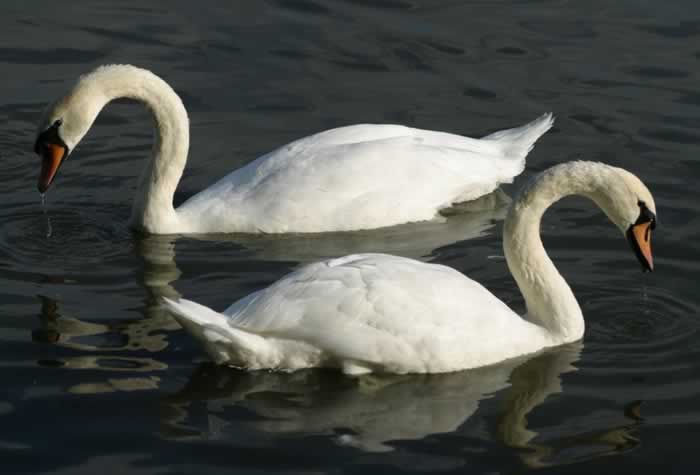 The mute swan plunges its long neck underwater to forage for aquatic plants. It also eats insects, fish, worms, and frogs. Mute swans also swallow gravel to help them digest their food!