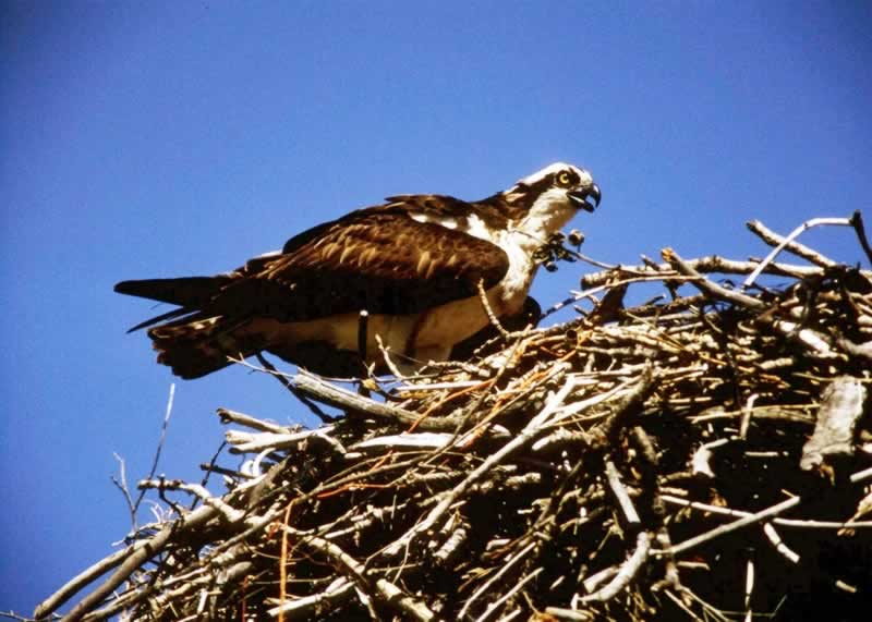 Project Osprey is based on the "if you build it, they will come" principle. Workers erect phone poles in desirable osprey habitat near prime fishing waters, and construct platforms and partial nests at the top. The human-made nesting platforms give the ospreys a head start, encouraging young ones to set up in unclaimed territory. The platforms also give wildlife scientists, like Chris Martin of Audubon, a chance to tag the birds and do research. Researchers put up metal guards around nesting poles and trees to discourage nest-robbing by predators. Osprey return to New Hampshire from southern wintering grounds each spring to breed near rivers, lakes, and estuaries where they hunt for fish. Recovery efforts have already helped the birds to expand their breeding range; roughly two dozen pairs of osprey have nested and raised young in four different New Hampshire watersheds -- Androscoggin, Merrimack, Connecticut and Great Bay -- in the last few years. Key Concepts