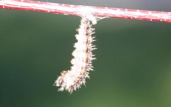 The female painted lady lays single pale green eggs on host plants. The eggs hatch in 3-5 days. The caterpillar is purple to black in color and has yellow and green strips and is covered in spines. It pupates in 5-10 days. The painted lady butterfly emerges from the