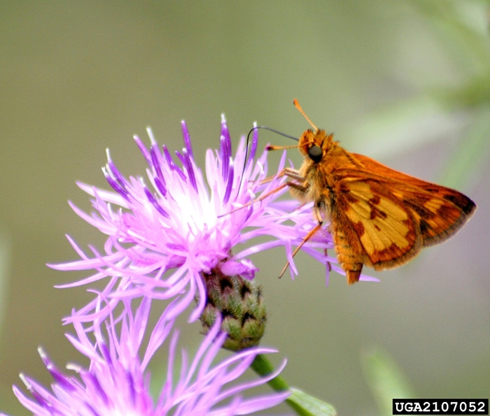The male Peck's skipper perches in sunny areas and waits for a female. The female lays one egg at a time on the leaves of a host plant.
