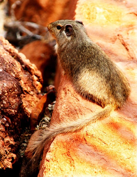 Petromuridae - dassie rat The dassie rat is 10-15 inches in length. It has a squirrel-like body; medium length legs with clawed feet; short, rounded ears; a yellowish nose with long black whiskers; and a long, furry tail. The dassie rat lives in rocky outcrops and is sometimes called the rock rat. It has a flattened skull and flexible ribs that make it easy for it to squeeze into tight openings in the rocks. It lives in small colonies, usually made up of a few individuals. The female dassie rat gives birth to a litter 2-3 fur-covered babies once a year, usually in December or January. The dassie rat babies eat solid food when they are around two weeks old. The dassie rat is an herbivore; it eats grasses, fruit, seeds, and leaves. The dassie rat is diurnal. That means they come out to feed in the morning and the afternoon. They run and jump across the rocks alone or in pairs in search of food. World Status Key US Status Key