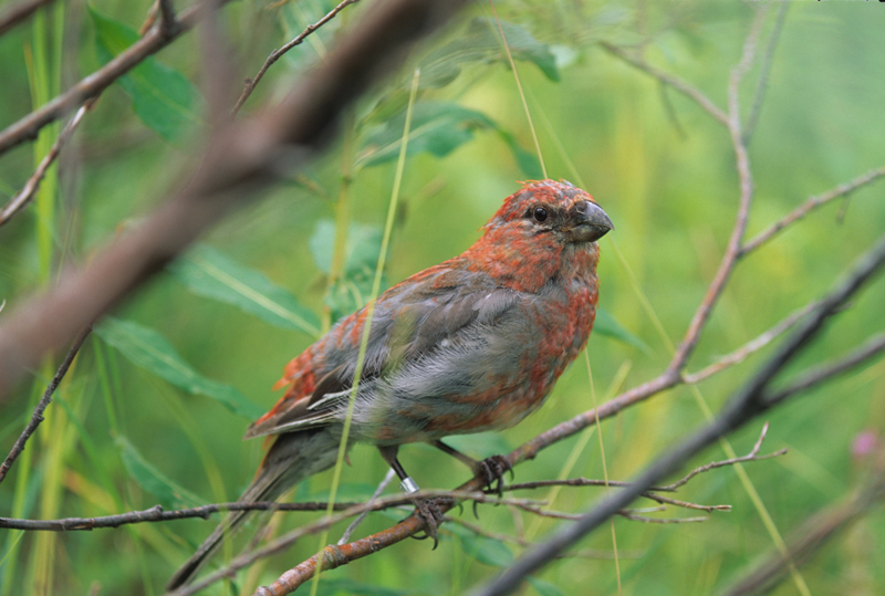 The pine grosbeak is 9-10 inches in length with a wingspan of 12-13 inches. It is a sturdy bird with a strong, short, cone-shaped bill; a long, slightly forked tail; and dark brown wings with white bars. The male has a rose-red head, breast, and back. The female has a yellowish-brown head and a gray breast and belly.
