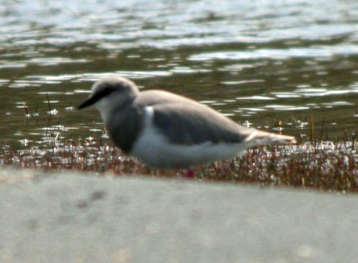 Pluvianellidae - Magellanic plover It is not a plover, although it was placed in the Charadriidae family once. Some thought it was a sandpiper because of its bill and that it should be in the Scolopacidae family. Others thought that the way it feeds it young made it part of the dove or Columbidae family. Using DNA analysis scientists discovered that it was most closely related to the sheathbills in the Chionidae family, but that it was different enough to deserve a family of its own. The Magellanic plover is a wading bird. It is a soft dove-gray on its uppersides and white on its belly. It has a black bill, pink legs, and red eyes. It feeds on small invertebrates that it finds on the shore. It often turns over stones and pebbles looking for food, like the ruddy turnstone. It also uses its legs to dig in the mud and sand for prey. Magellanic plovers nest on the ground. The female lays two eggs, but only one usually survives. Both parents incubate the eggs and feed and care for the chick. The parents feed the chick crop milk like doves feed their chicks. The Magellanic plover is the only wading bird that uses this method to feed its chicks. World Status Key