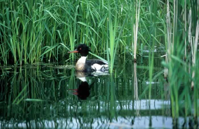 The red-breasted merganser breeds on the tundra in freshwater and brackish wetlands and protected bays. It winters on coastal bays, estuaries, and protected coastal areas. DietThe red-breasted merganser dives and uses its serrated bill to catch and hold fish, crustaceans, and tadpoles. It brings its prey back to the surface and eats it! Sometimes small groups of red-breasted mergansers will work together to herd fish into shallow water. Life Cycle Behavior