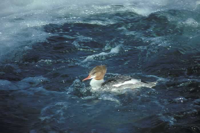 The female has a bluish-gray breast, back, and wings, a white belly, and a reddish-brown head. The red-breasted merganser looks similar to the common merganser, but it is a little larger and the male has a reddish breast. Range |
