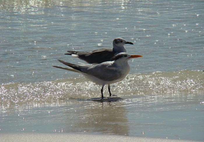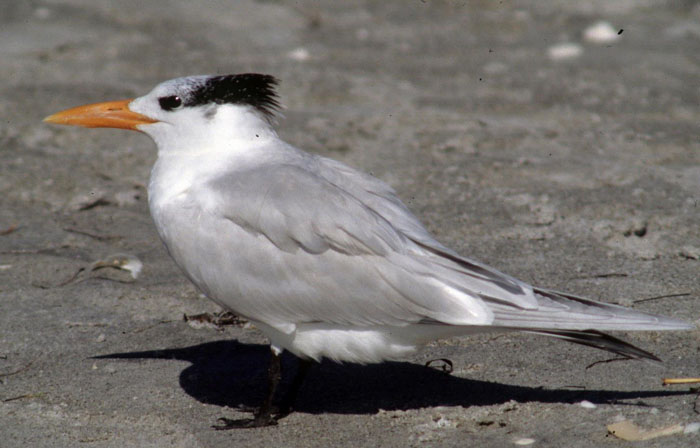 The royal tern is found on sandy beaches, harbors, estuaries, and waters near the coast.