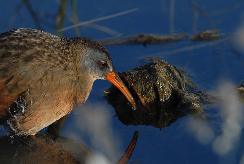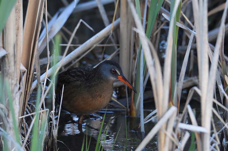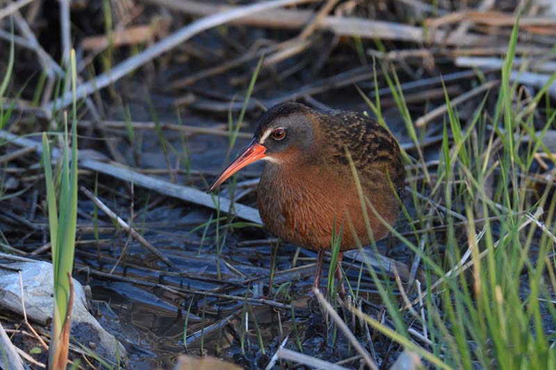 Habitat Diet Life CycleNests are built in May. Male and females build their nest together in a marsh with abundant plant cover. Above their nest, they build a canopy by weaving surrounding tall plants for added protection. The Virginia rail often builds several dummy nests in its territory. BehaviorThe Virginia rail has very strong legs and weak wings. With its strong legs, it can walk and run on floating marsh plants. It only flies during migration. |